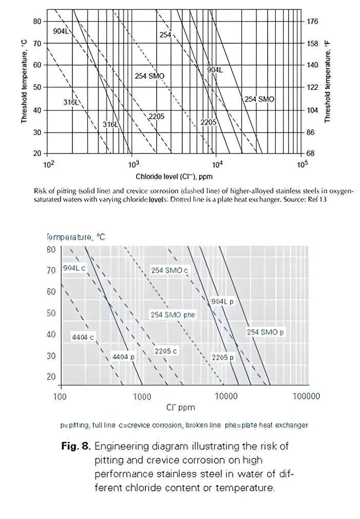 一、下圖為不銹鋼、超級(jí)不銹鋼和鈦材所用氯離子環(huán)境。紅色為低ppm和低溫環(huán)境,選用常規(guī)不銹鋼304,綠色高溫和高ppm環(huán)境,先用純鈦TA1。從圖表可以看出,耐氯離子腐蝕有個(gè)簡(jiǎn)易的排列:304<316L<904L<254SMO<純鈦